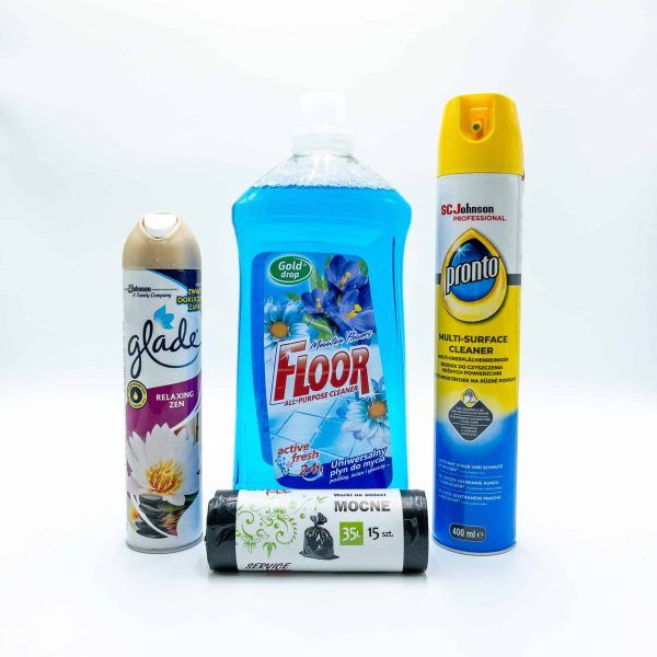 Idealny zestaw do sprzątania biur, pokoi. W jego skład wchodzą: odświeżacz powietrza, płyn uniwersalny do podłóg, spray do mebli oraz worki na śmieci.